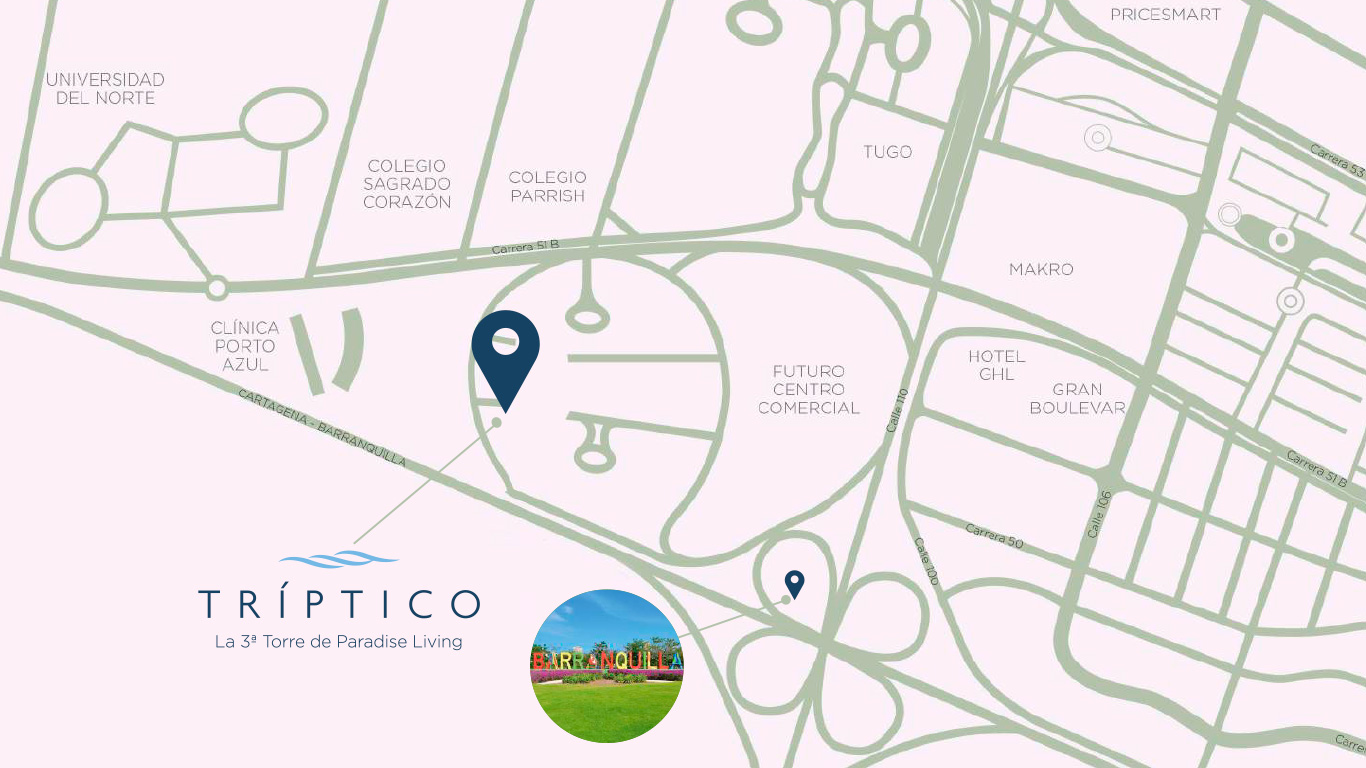En Tríptico la tercera torre de Paradise Living ahora podrás vivir a pocos minutos de importantes instituciones educativas como el Colegio Sagrado Corazón, Colegio Parrish y la Universidad del Norte. También encontrarás muy cerca de tu nuevo hogar la reconocida Clínica Porto Azul y podrás visitar a pocos minutos, sitios comerciales como Price Smart y el C.C. Buenavista, entre otros.